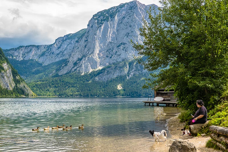 With E-Bike and dog bike trailer and my engine-less mountain bike, respectively, we ride down from the Wasnerin to Altaussee, then take the highh road to Grundlsee, after a ride half way the lake and a break, back via the Archkogl, Gallhofstraße, Hintenkoglweg und Reithgasse to Bad Aussee. After an ice cream at the main square, steep up back to the Wasnerin. 24 km some significant ascents.