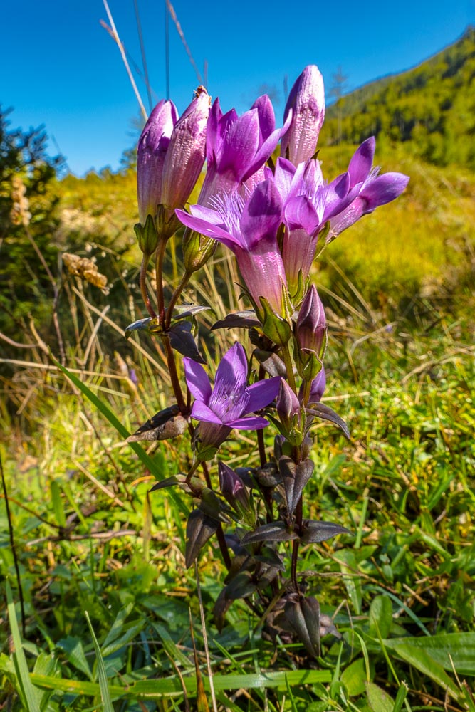 Lots of dwarf gentians (Gentianella sp.) in the grass.