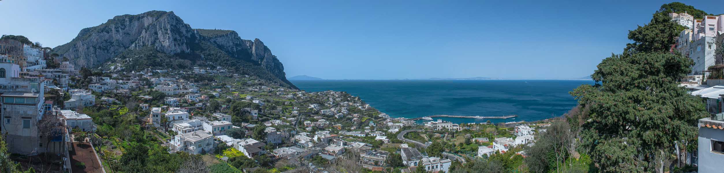 Panoramablick von der Bergstation der Standseilbahn Richtung Monte Solaro und dem Hafen Marina grande.