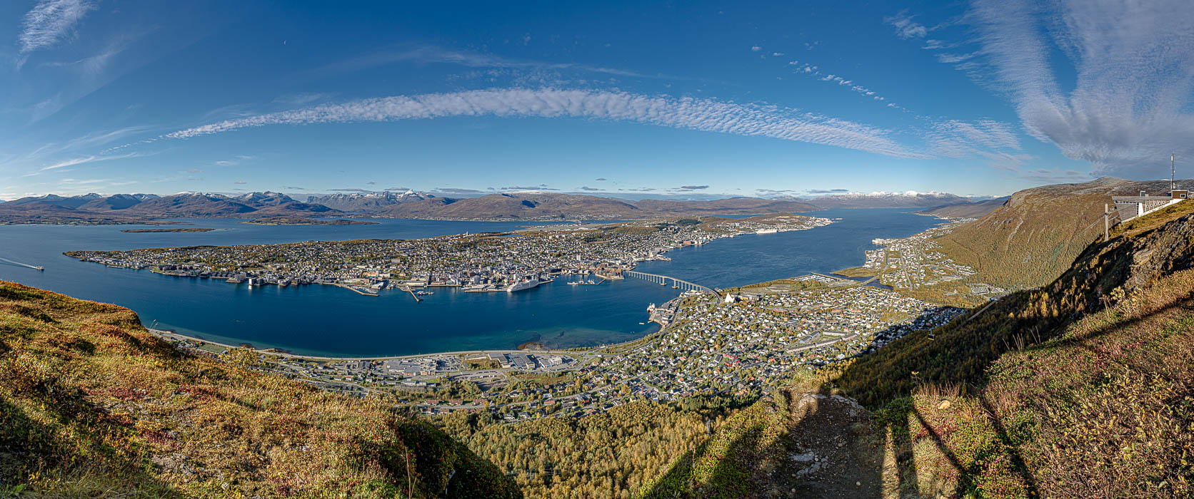Panoramablick auf Tromsø vom Storsteinen, der Bergstation der Fjellheisen - Seilbahn. Gut erkennbar die Insel Tromsøya, auf der Tromsø ursprünglich erbaut wurde. Viele Jahrhunderte lang konnte die Stadt nur auf dem Seeweg erreicht werden.