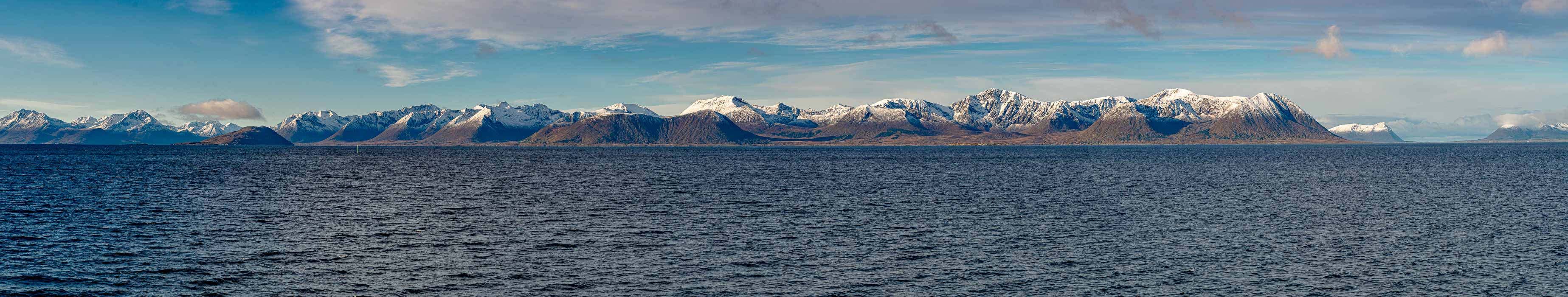 Panoramic view of the northwestern mountains of Hinnøya. Far right the island of Andøya.