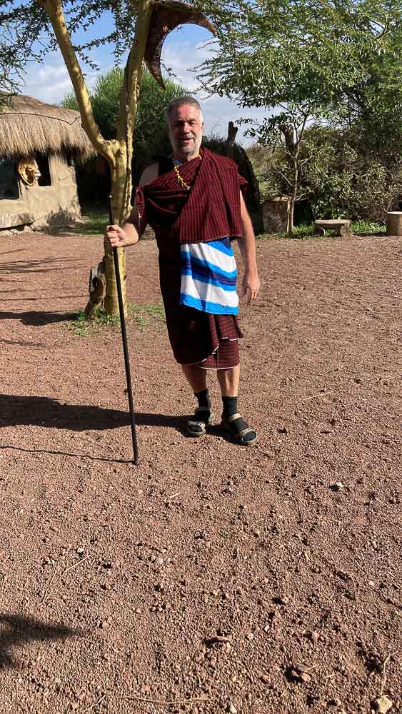 In the afternoon, I am completely vested as a Maasai. I planned to welcome Dr. Cornelia Wallner with the staff, but she takes a different route not over the hill and with a different car, all of a sudden she was here.