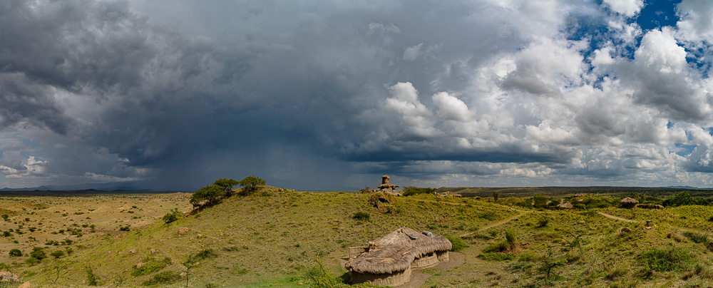Panoramic picture from the Original Maasai Lodge, Regenschauer over Kilimandscharo. Click here or into the picture for a larger display.