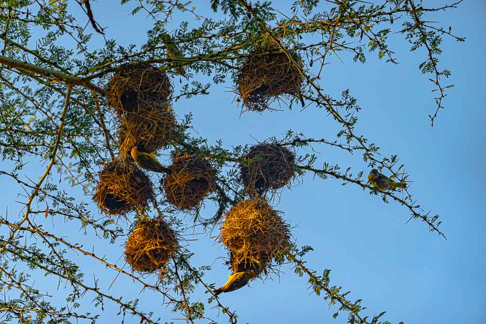 Weaver birds have built their nest in the acacia at the restaurant (Video).