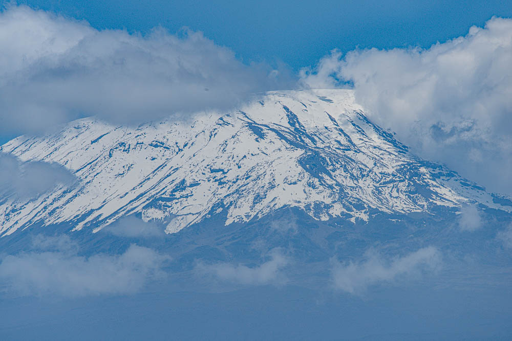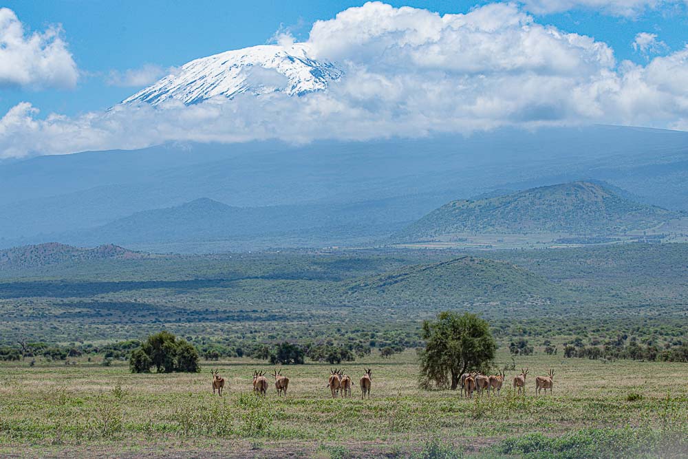 Elen antilopes, an extraordinary big herd; to the left in the background the scond, lower summit of Kilimandscharo, Mawenzi (5.148 m), to the right and in front the higher main summit Kibo (5.895 m).