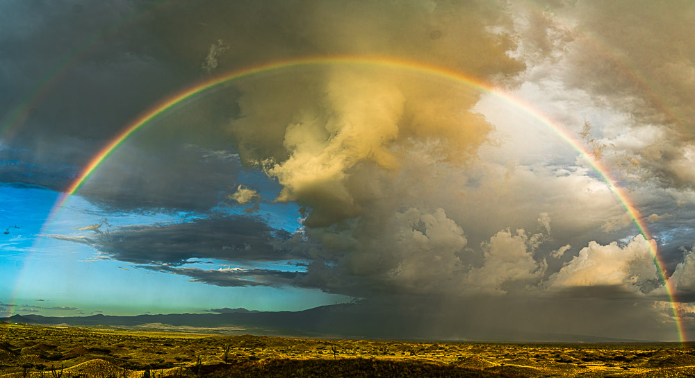 A second rainbow appears at the end of the show. Also mind the rising moon above the foothills of Kilimandscharo.