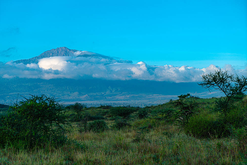 After a short coffee at 7 a.m., we start the walk. First sunrays on Mount Meru