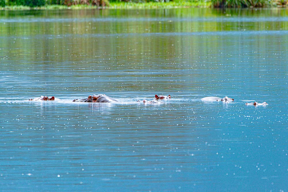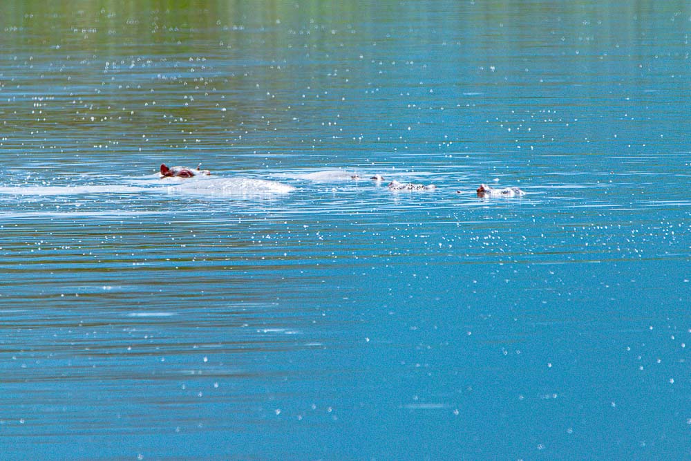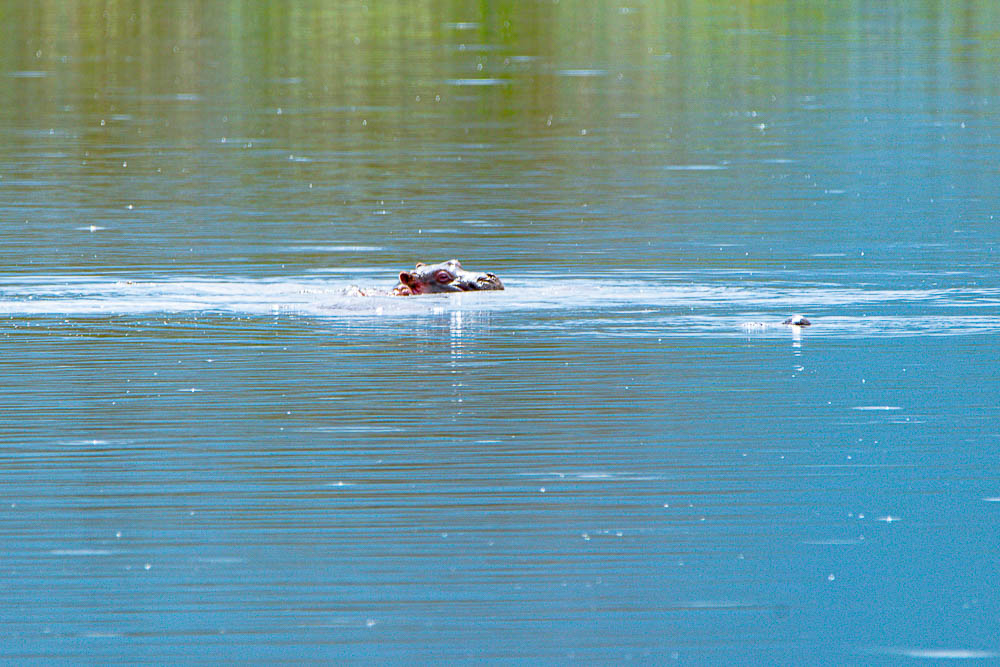 Hippoes in the water, but very distant, so I have to zoom in maximally (600 mm) and put the camera on the lunch bag places of the lunch table.