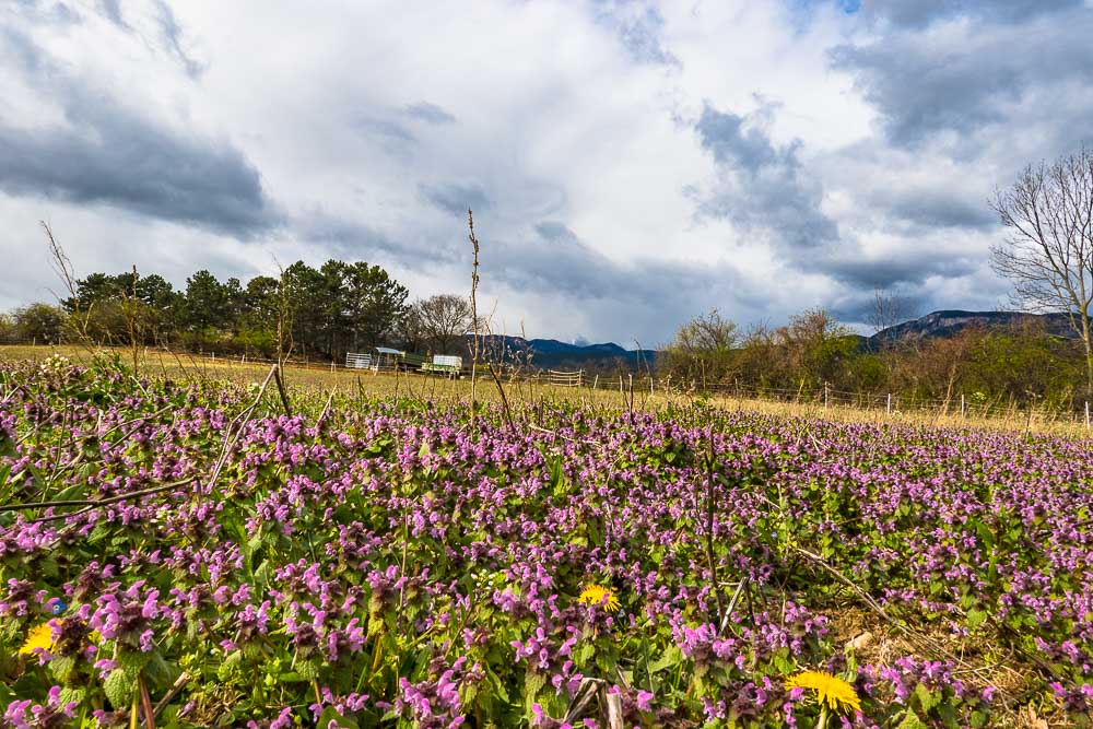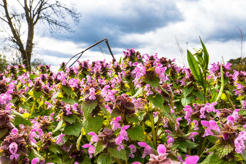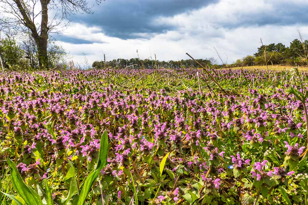 On the hill near the bush on a past cow paddock Kuhweide lots of spotted dead - nettle (Lamium maculatum).
