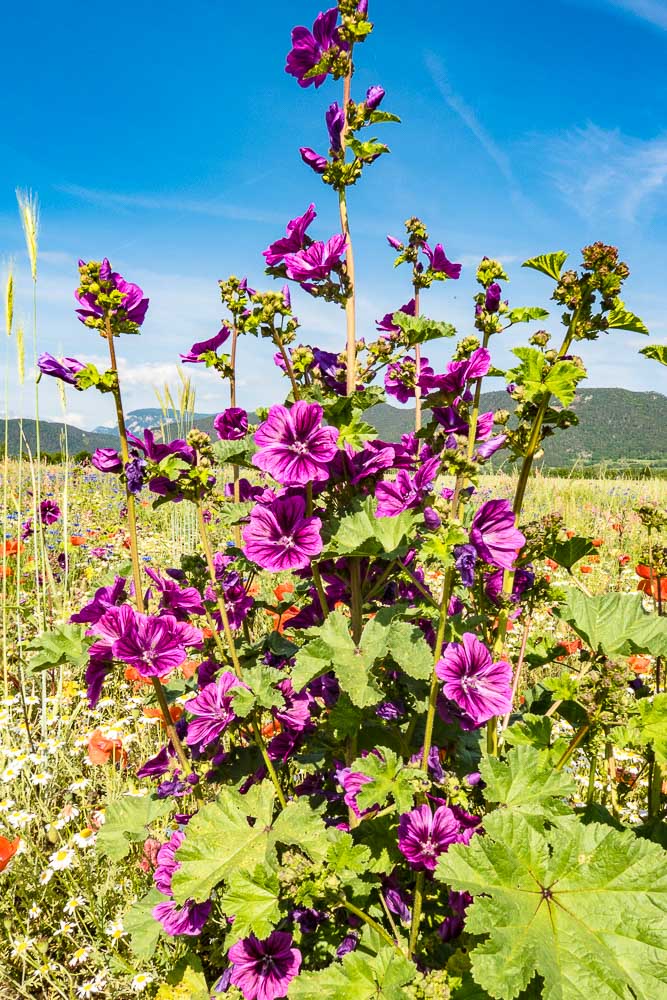 Kornblumen, Klatschmohn und mauretanische Malve, dazu noch Acker- Hundskamille (Anthemis arvensis)