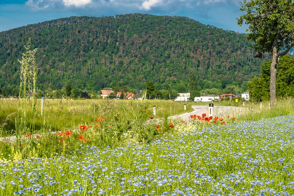 Leinfeld kurz vor Winzendorf, im Hintergrund die Fischauer Berge