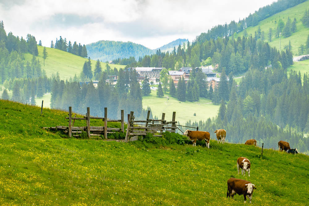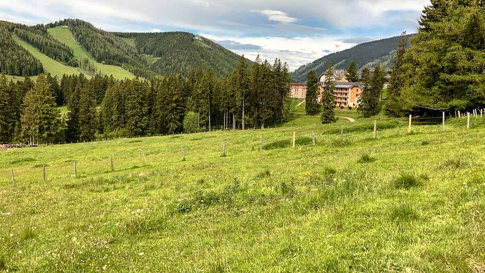 30.5.2024: ein kurzer Spaziergang vom Hotel aus auf gleicher Höhe, einen Wiesenweg entlang über die Almfläche.