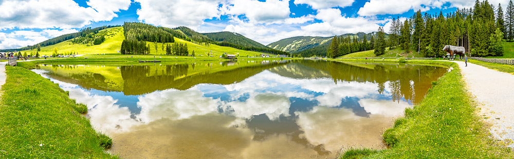 Panorama des Teichalm - Sees, von der Ostseite aus. Hierher oder ins Bild klicken für eine größere Darstellung.