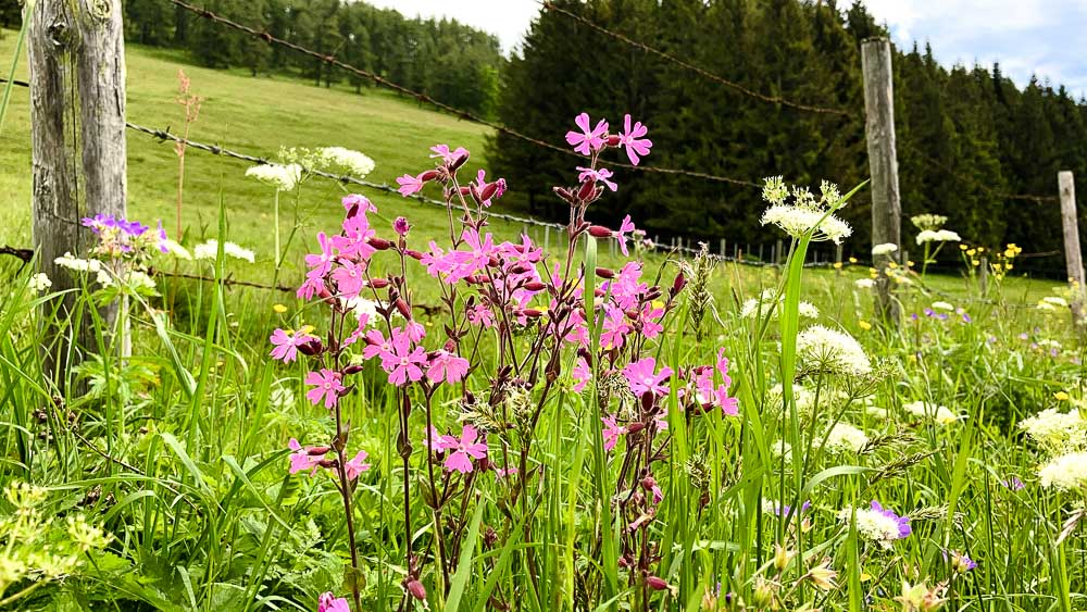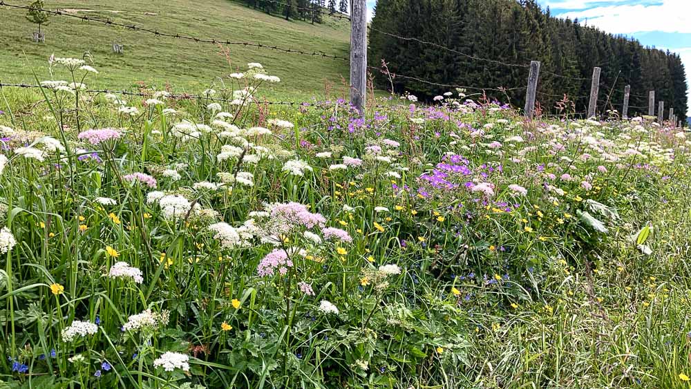 Nur am Wegrand, wo weder gemäht noch gedüngt wird oder Kühe grasen, wachsen auch Blumen: Alpen-Kälberkropf (Chaerophyllum villarsii) und Wiesen - Storchschnabel (Geranium pratense)