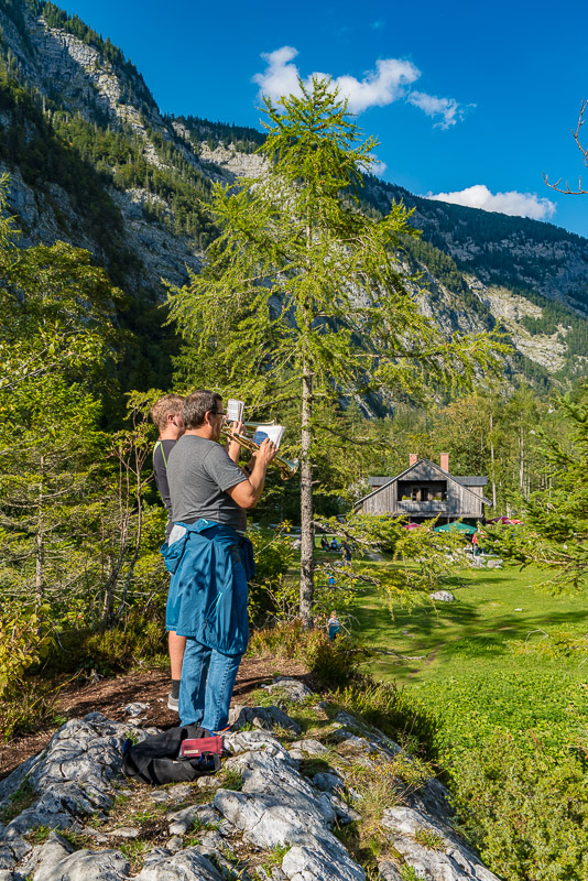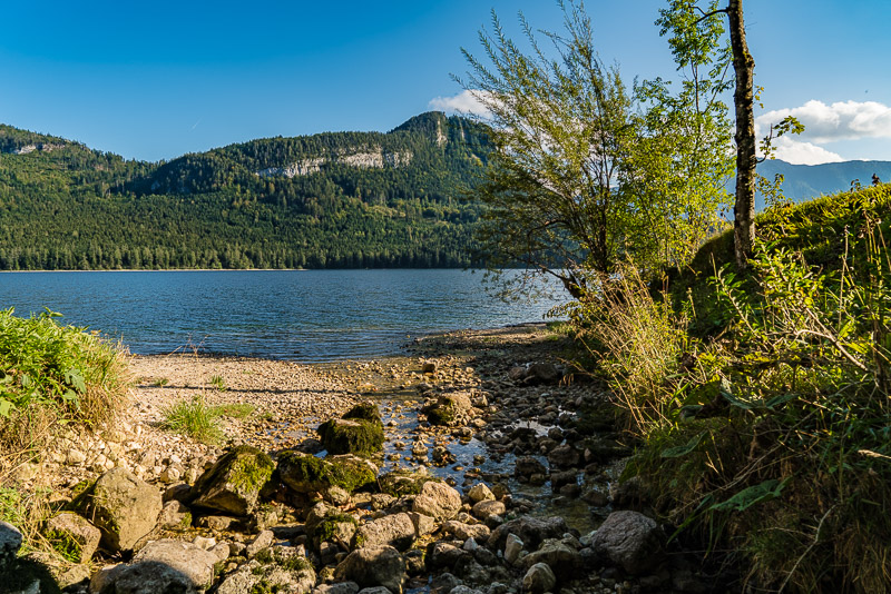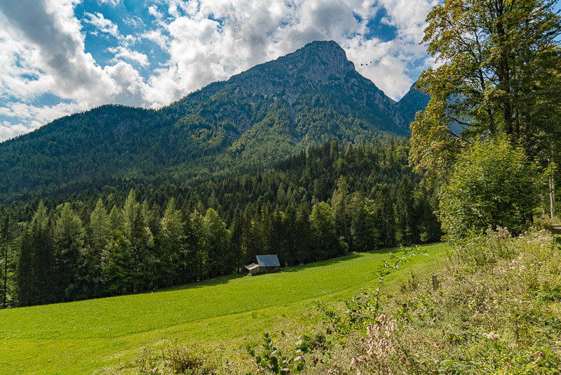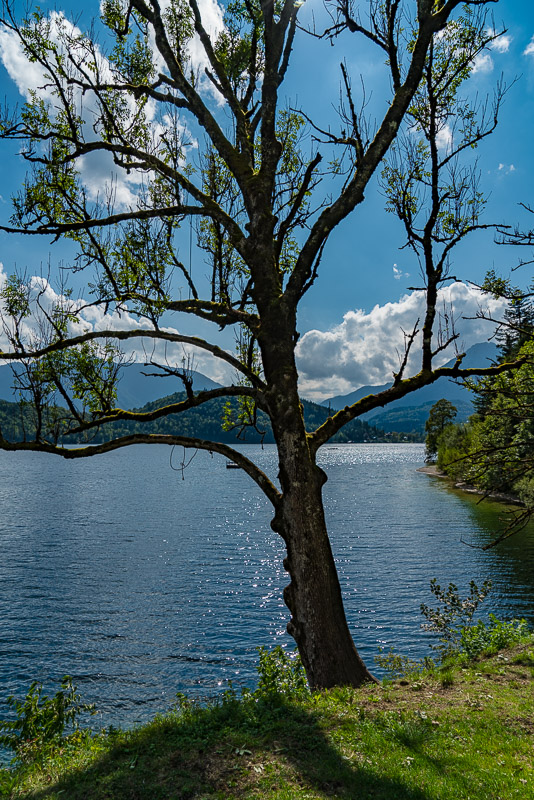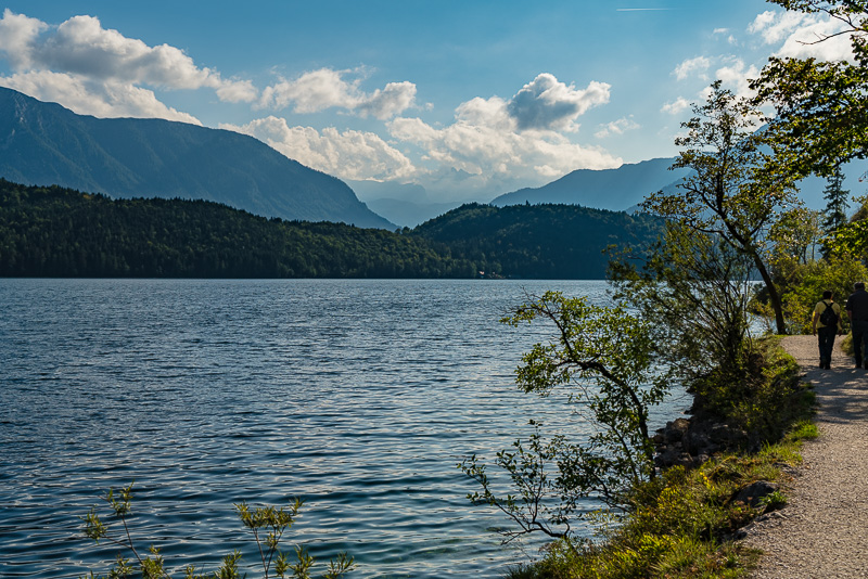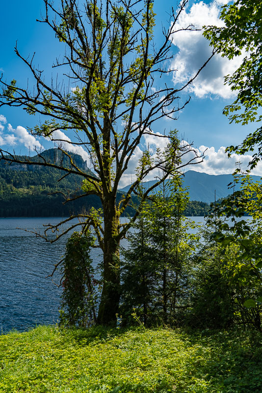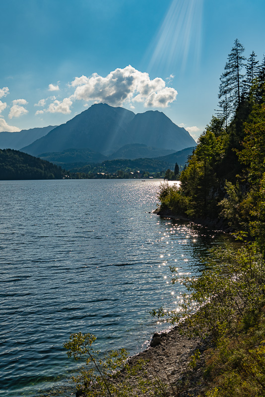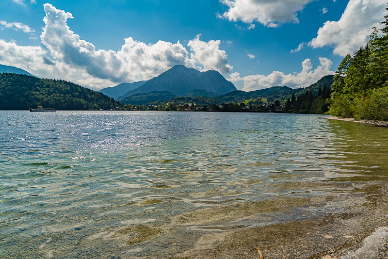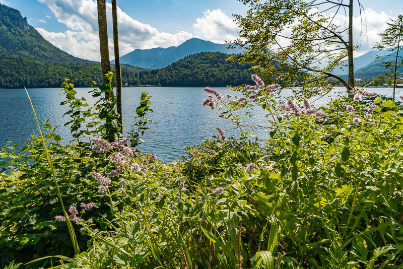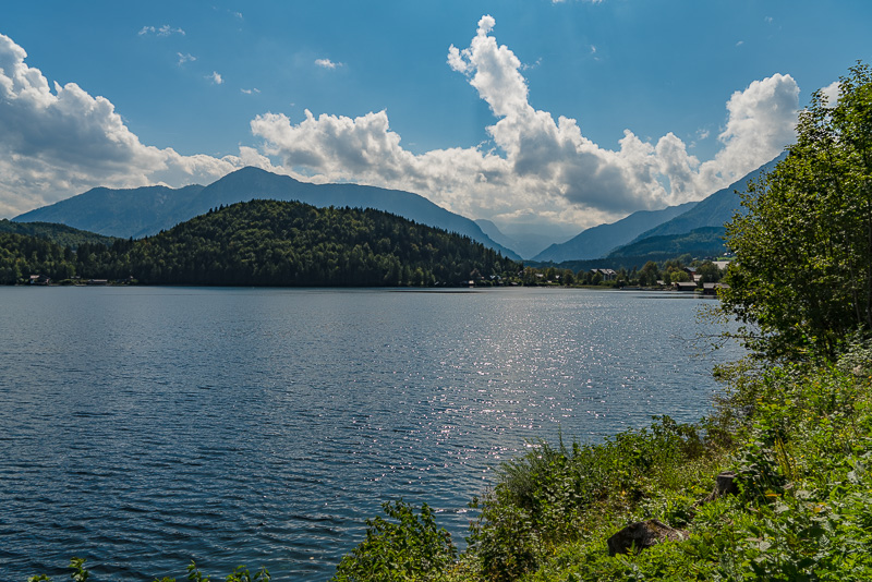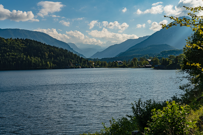 Beim Altausseer See starten wir gleich am Weg entlang des Sees. Nach dem gestrigen Regen hat es in der Früh aufgerissen - nur der Dachstein ist noch in Wolken.