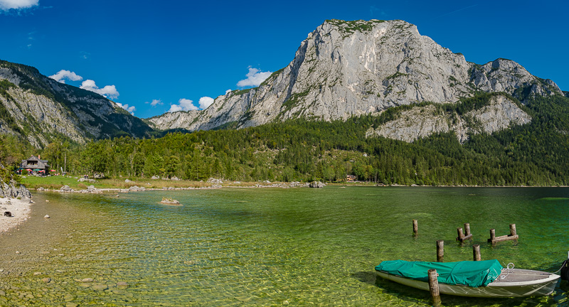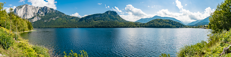 Panorama des Altausseer Sees. Ganz links die Trisselwand, dann der Tressenstein, ganz hinten der Ausseer Zinken. Hierher oder ins Bild klicken für eine größere Darstellung.
