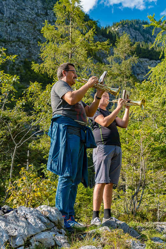 Einheimische haben ihre Musikinstrumente mitgebracht und blasen eine Fanfare von diesem Felsen.