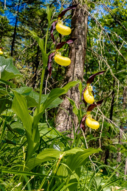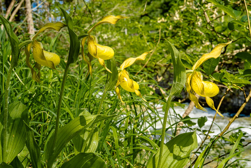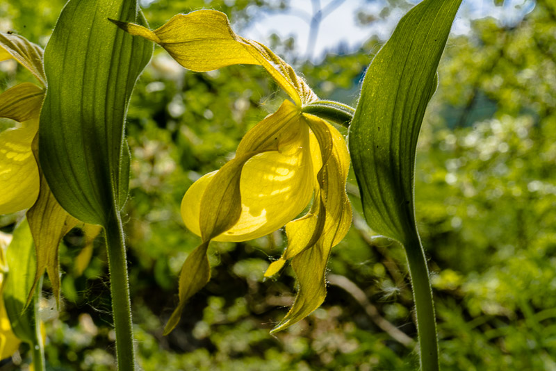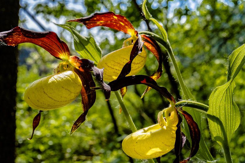 Die Spezialität dieses (kleinen) Frauenschuh - Standortes sind aber einige Exemplare der Frauenschuh (Cypripedium calceolus) - Variante mit vollständig gelber Blüte, auch als Goldschuh, lateinisch "variatio flavum" bezeichnet.