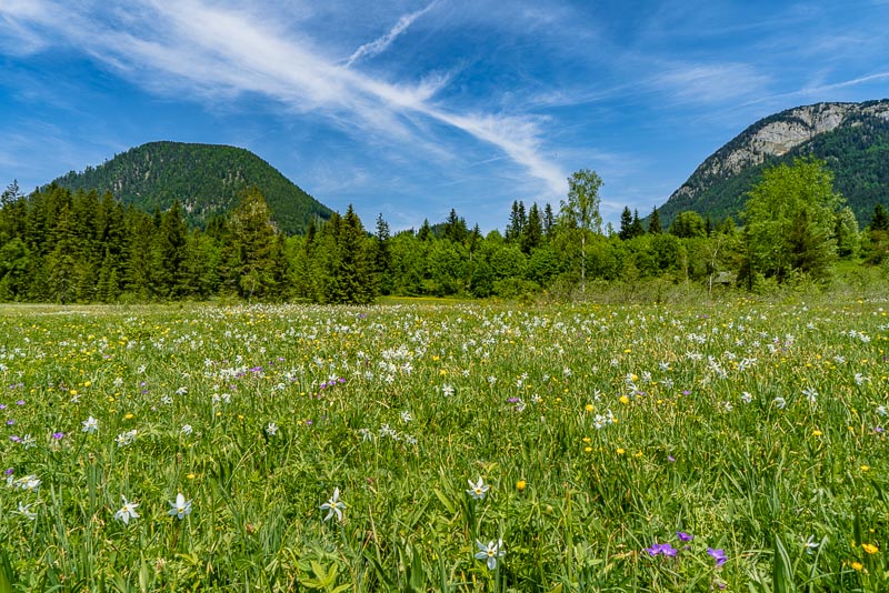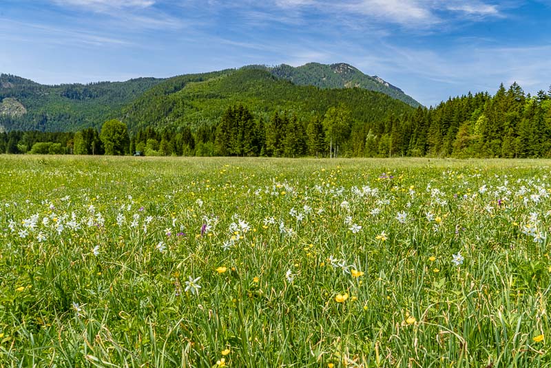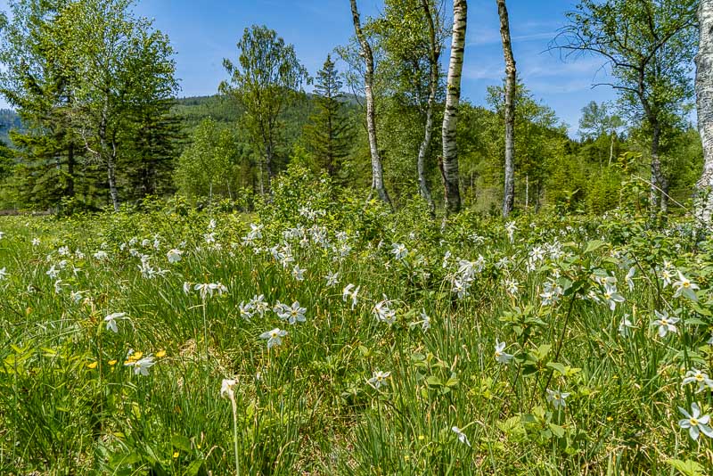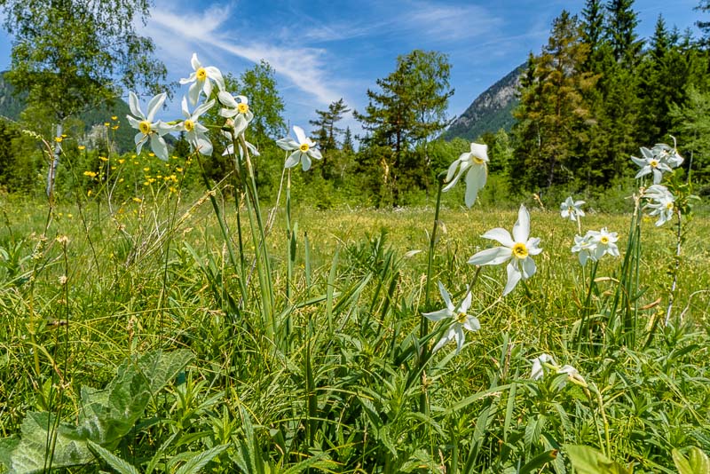 Als zweites Ziel wählen wir das Feuchtgebiet zwischen Kainisch und dem Ödensee. Hier gibt es wunderbare Bestände der Stern - Narzisse (Narcissus radiiflorus)