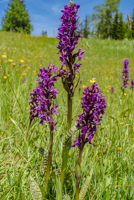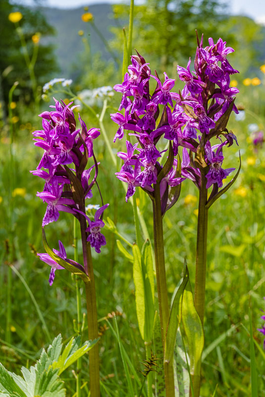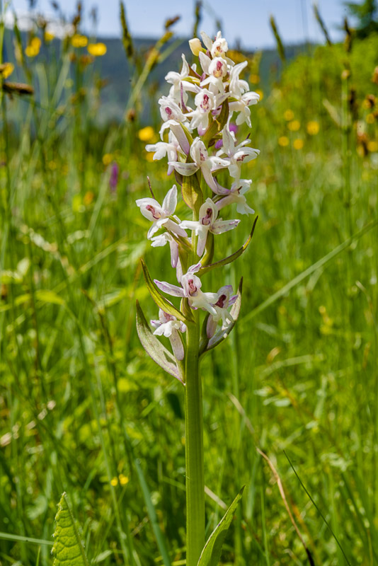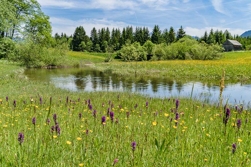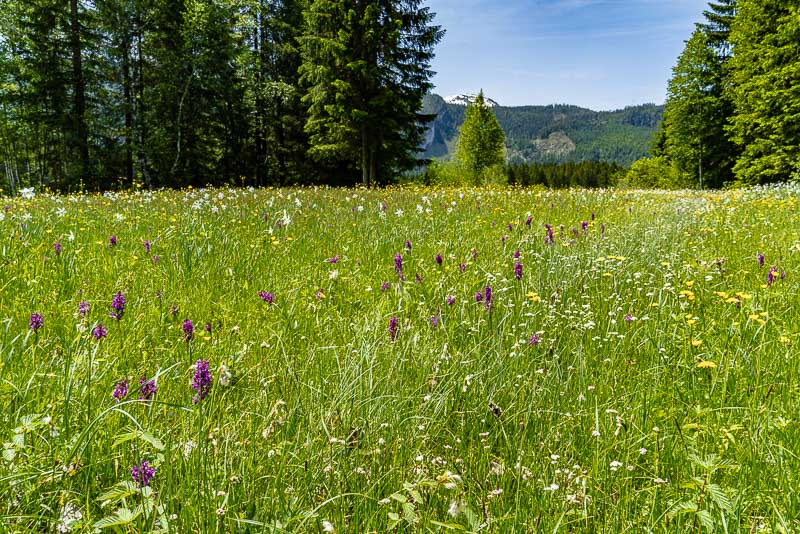 An einer noch feuchteren Stelle finden sich auch massenhaft Breitblättriges Knabenkraut (Dactylorhiza majalis).