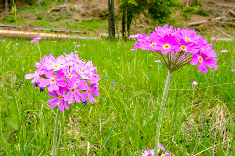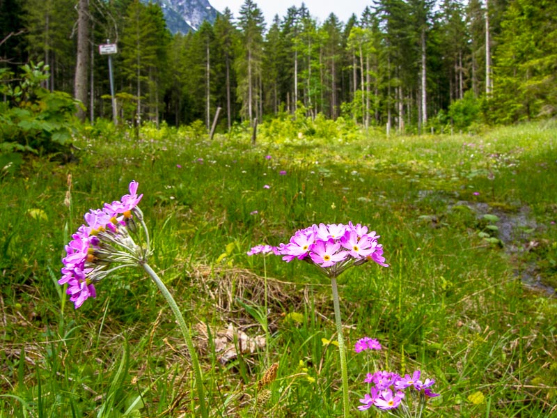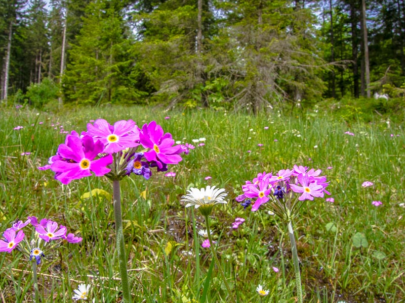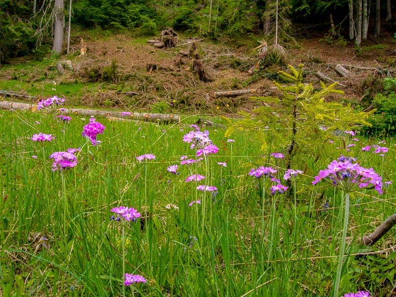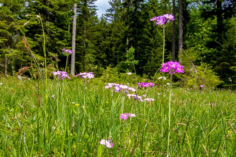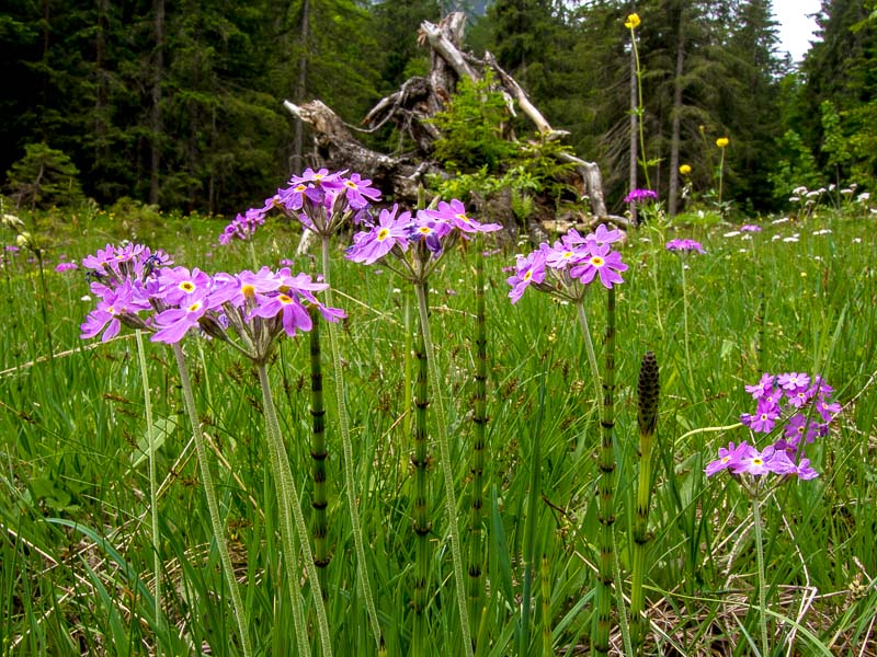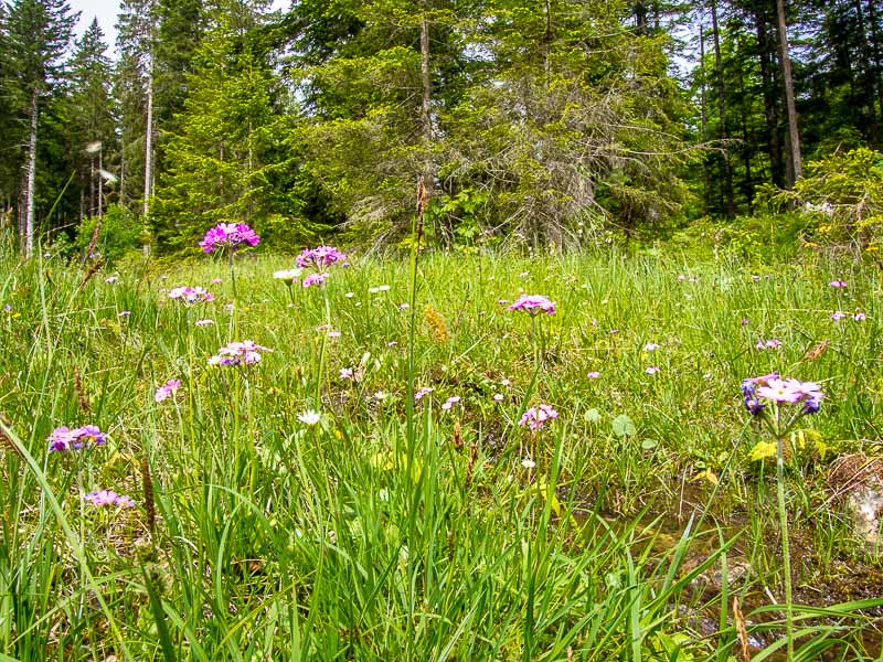 Near the way back, on a different route, another wet meadow with Bird's-eye primroses (Primula farinosa) in abundance.