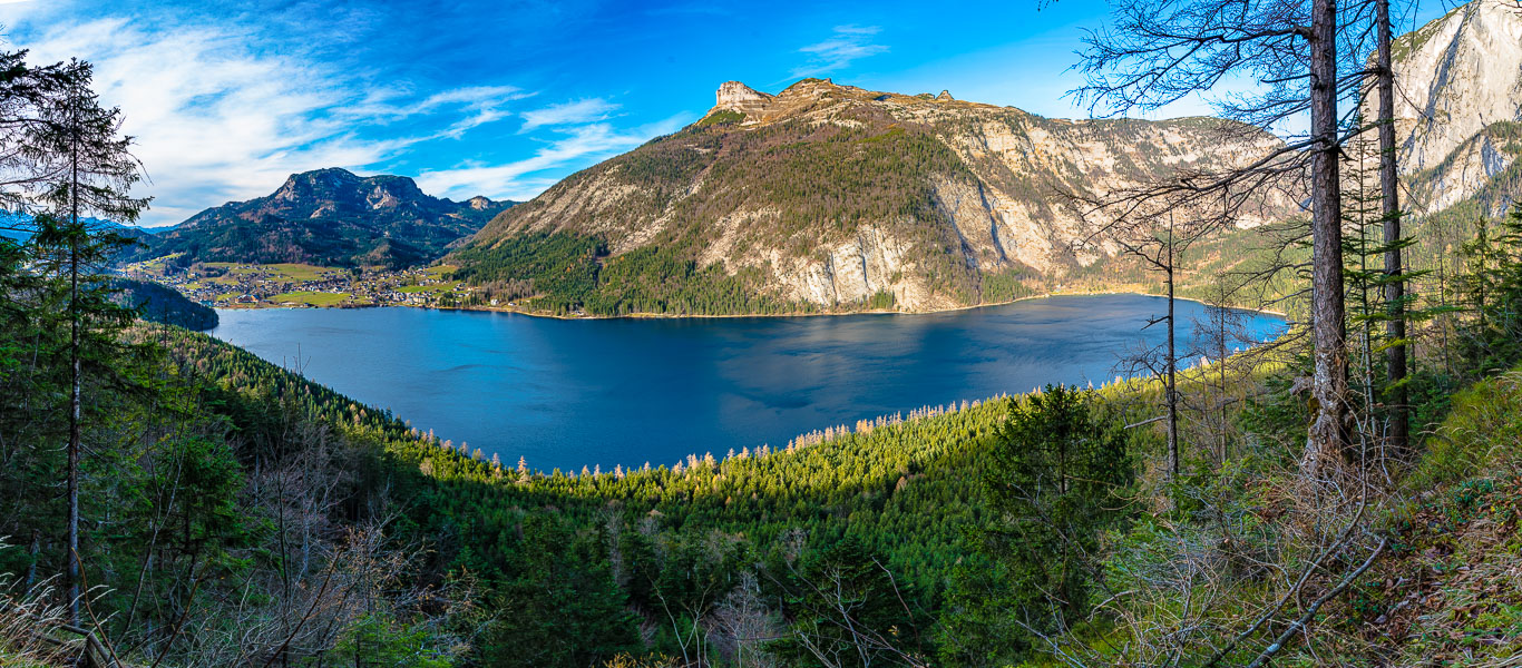 Panorama des Altausseer Sees, mit dem Loser (1.837 m) dahinter. Links die Ortschaft Altaussee.