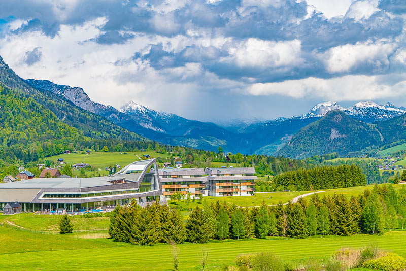 Panorama view from the roof terrace of the Wasnerin - Sandling, Loser, Trisselwand, Totes Gebirge, and the mountains around the Tauplitzalm. Click here or into the picture for a larger display.