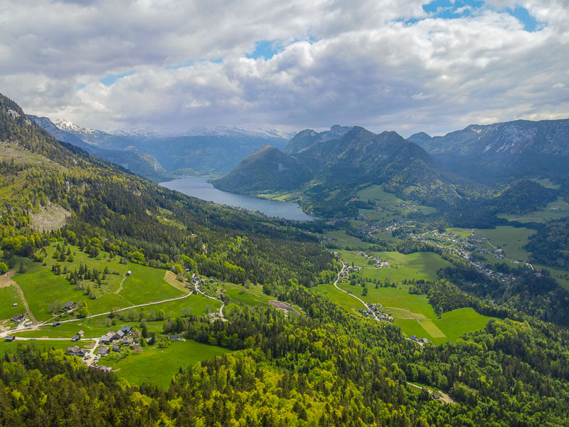 The drone is now high up and a bit more distant. View to Altaussee, ...
