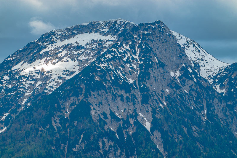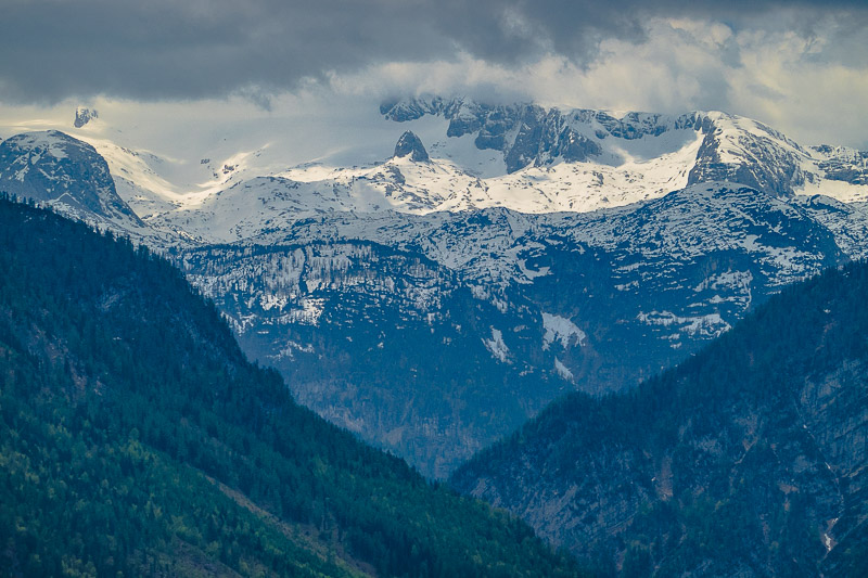 A picture of the Dachstein, taken with the telephoto lens. After the cool spring, the mountain is covered with snow even down to deeper regions. The summit is wrapped in clouds.