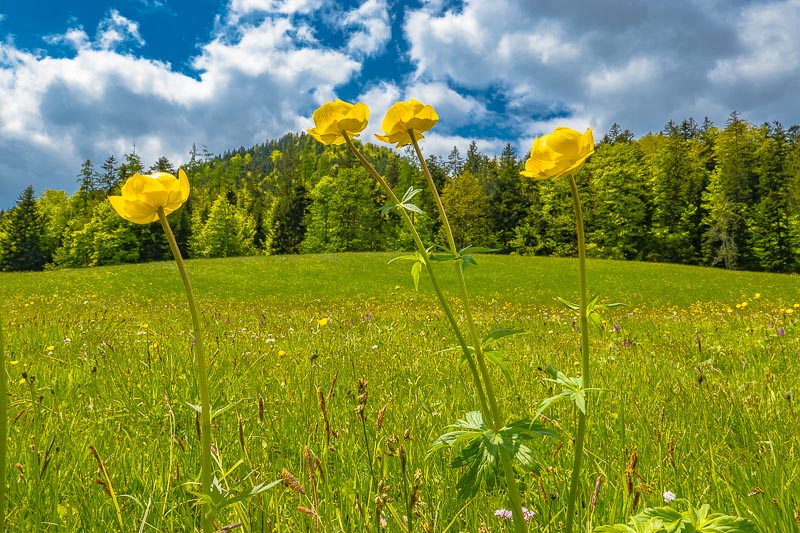 Near the car park, a small path of wet grassland with globe flowers (Trollius europaeus) ...