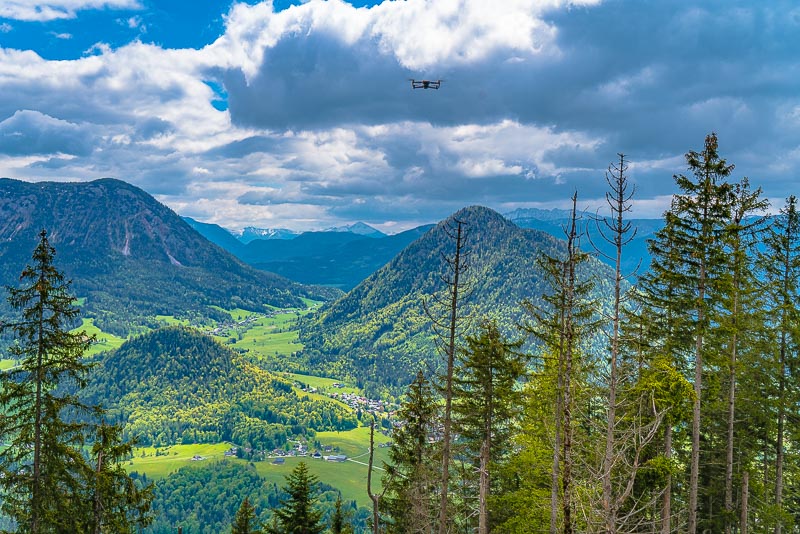 The little helicopter takes the view over the forest to the head of lake Altaussee and to the Trisselwand.