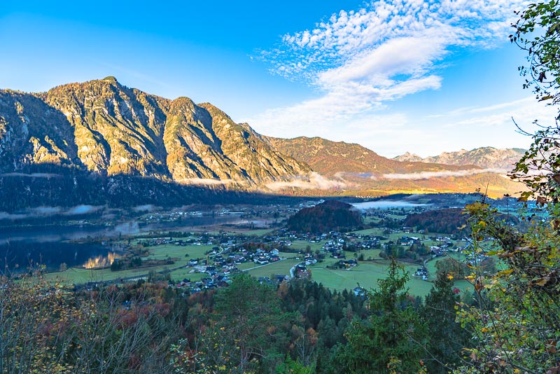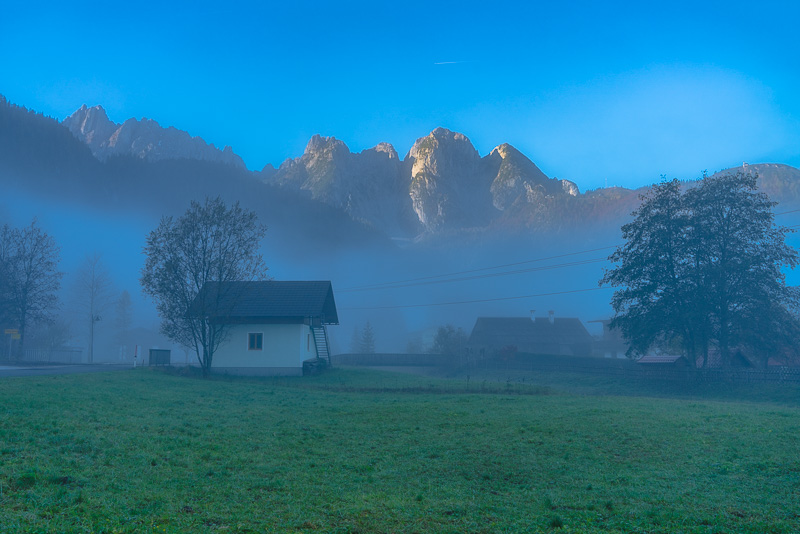 The village of Gosau is covered with ground mist, which only lifts at the upper end of the village, at the ascent to Lake Gosau.