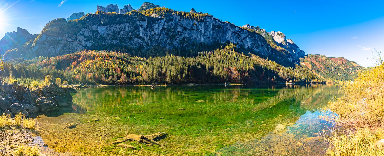 Panoramic picture of lake Gosau, with the mountain ridge behind.