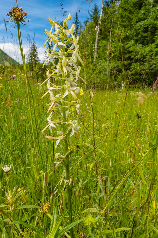 Zweiblättrige Waldhyazinthe (Platanthera bifolia) auf einer das Moorgebiet begleitenden Wiese.