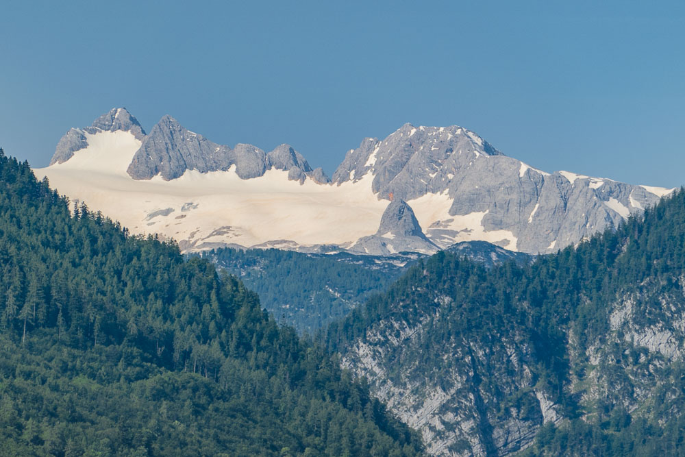 In der Früh der Blick vom Hotel zum Dachstein mit seinem Gletscher, heuer noch mit recht viel Schnee drauf.