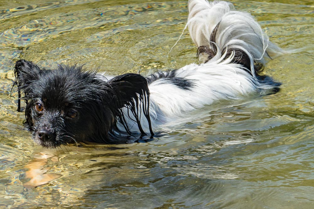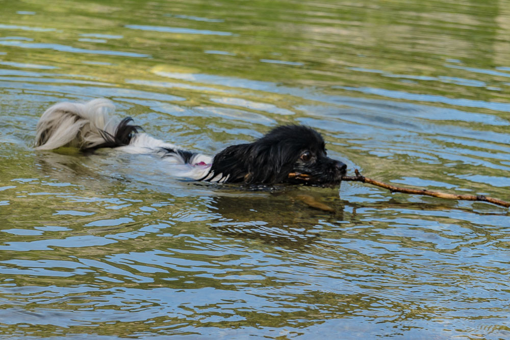Die Hunde spielen am Schotterstrand, nur Bella wagt sich ins Wasser, um den Stock zu holen. Es ist aber ziemlich heiß heute.