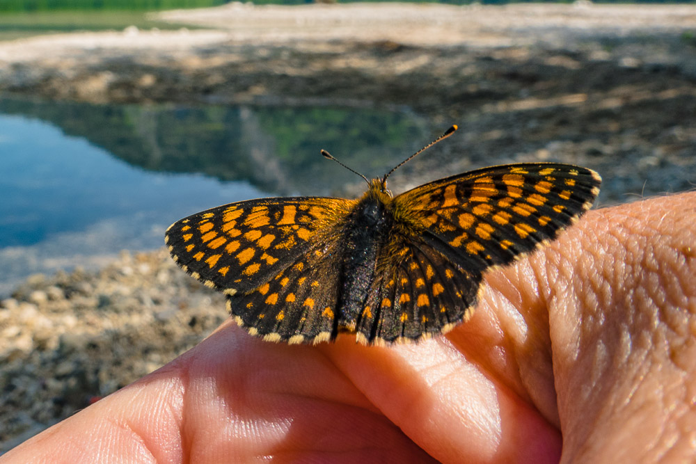 Dieser Flockenblumen - Perlmuttfalter (Melitaea phoebe) fühlt sich auf Susi´s Hand ziemlich wohl.