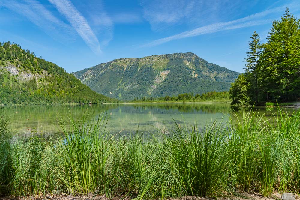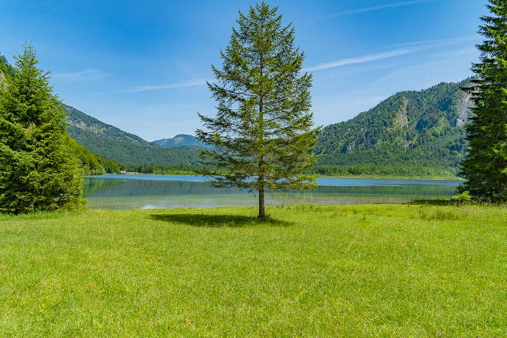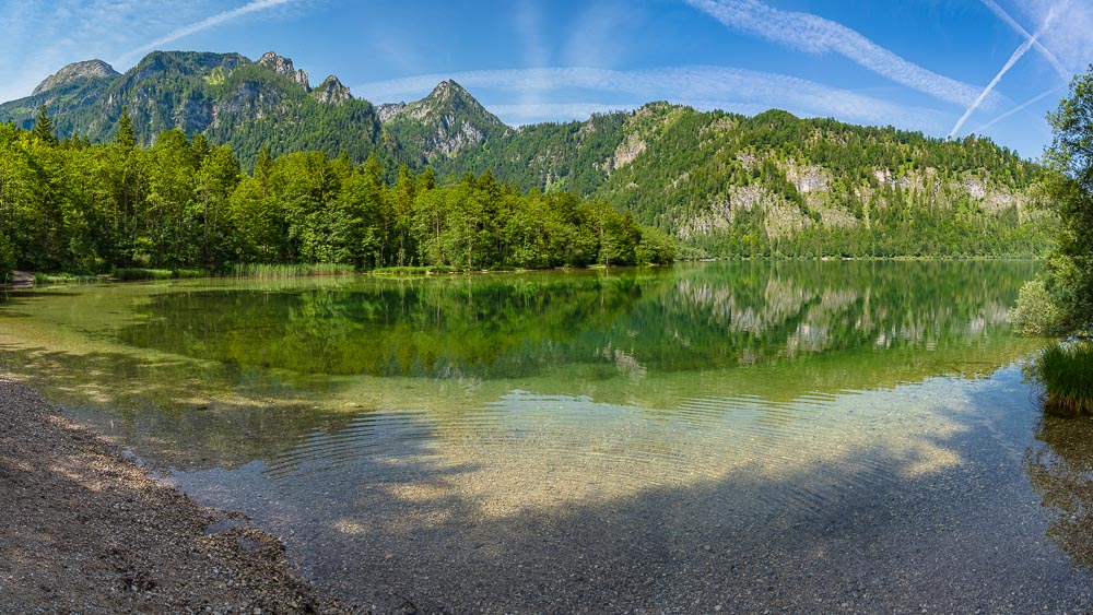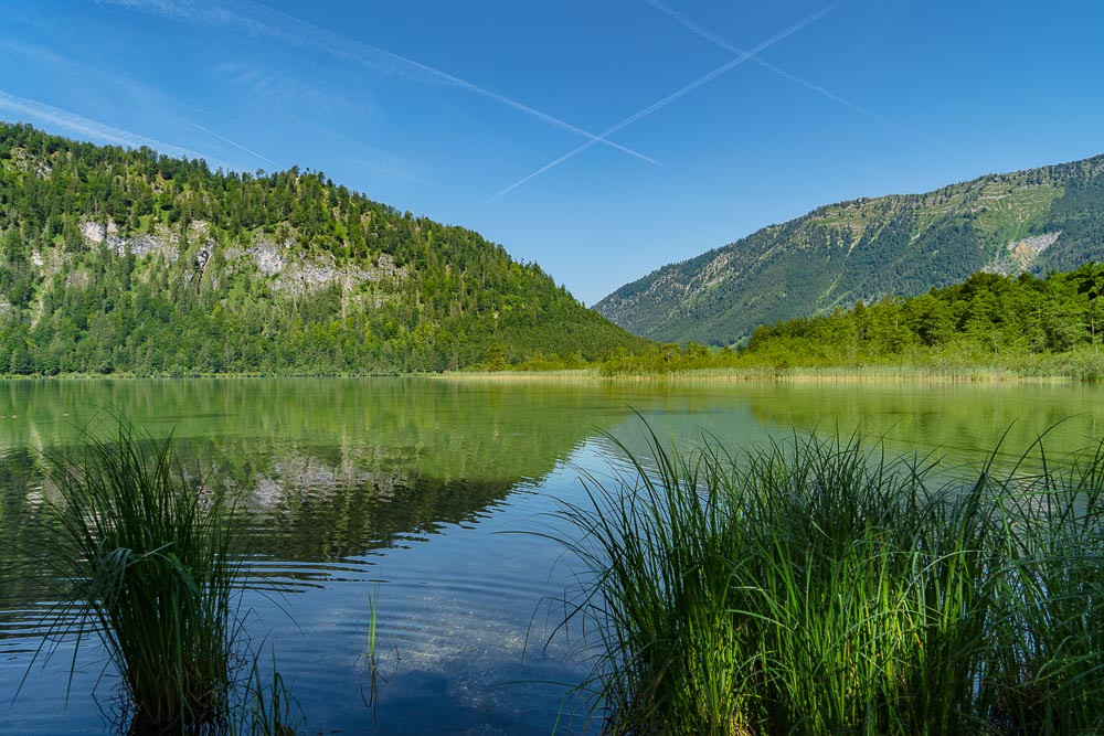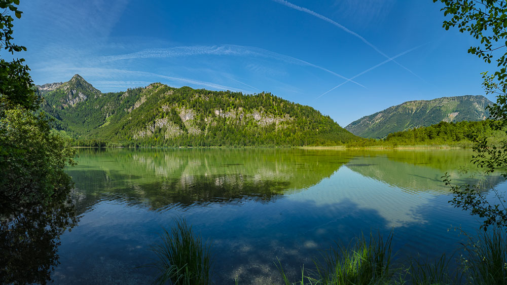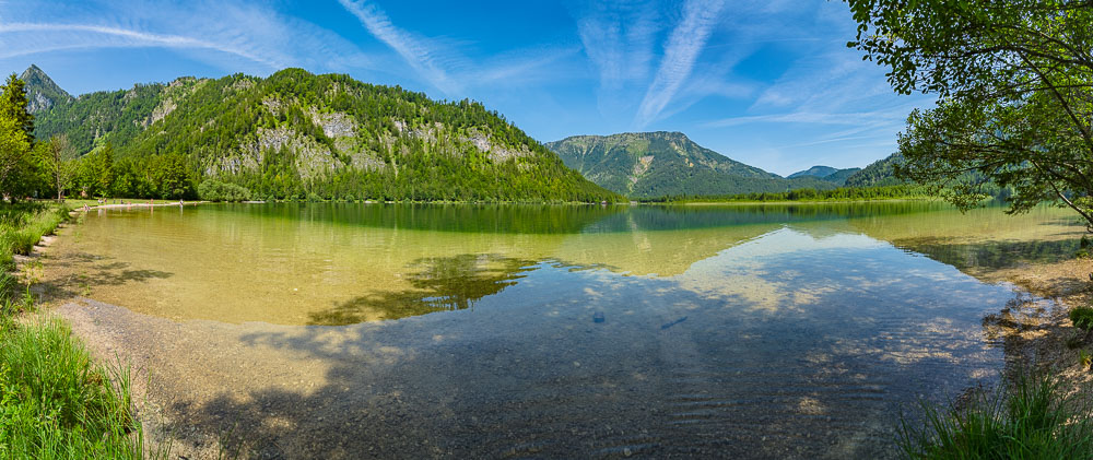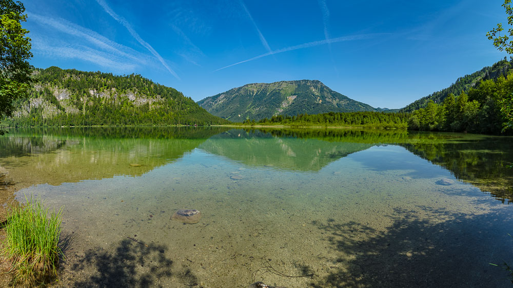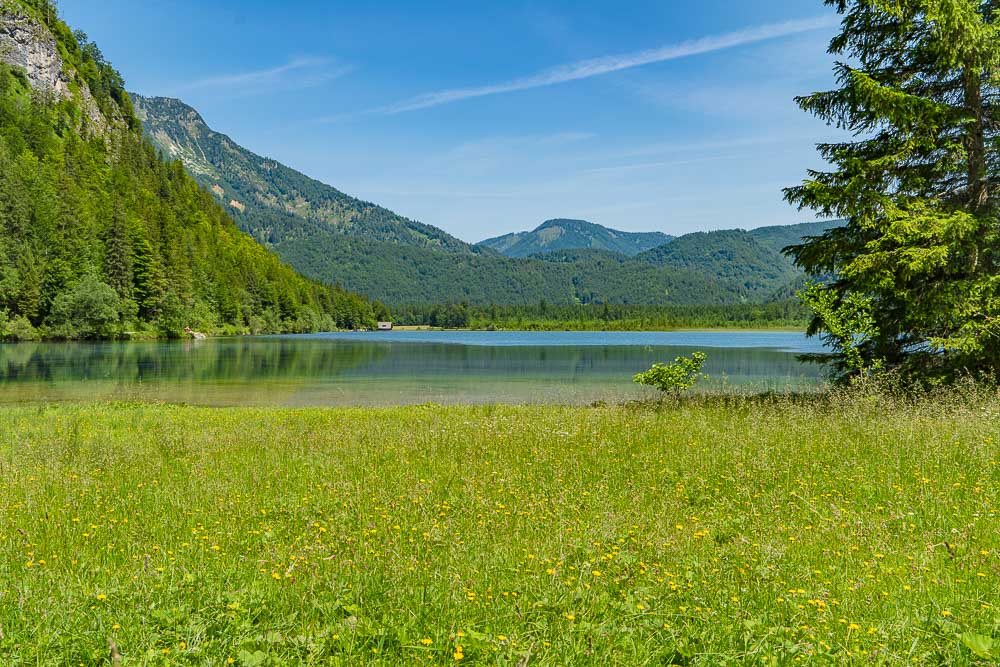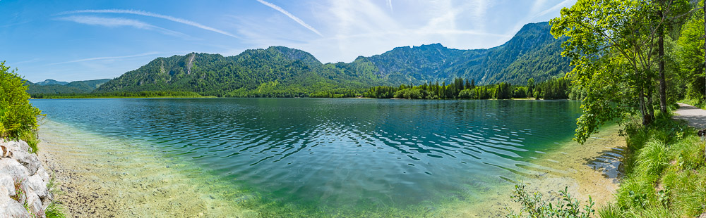Panoramablick über den Offensee, zum Abfluss hin. An der gegenüberliegenden Seeseite ist das Gelände ziemlich steil.