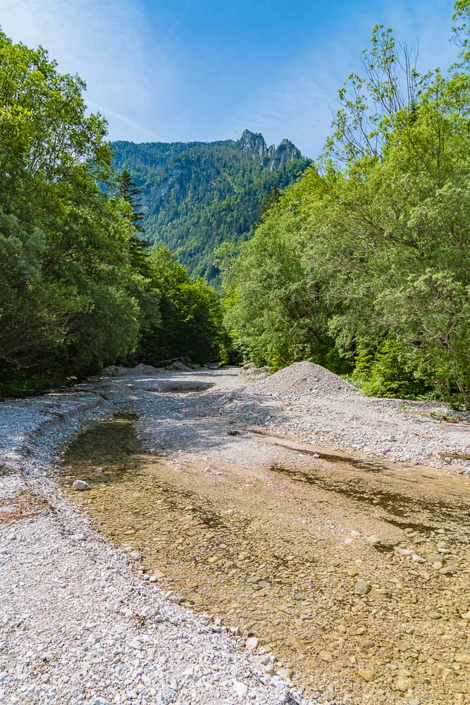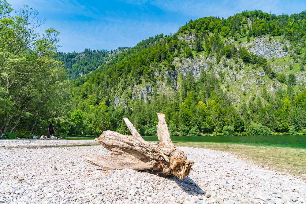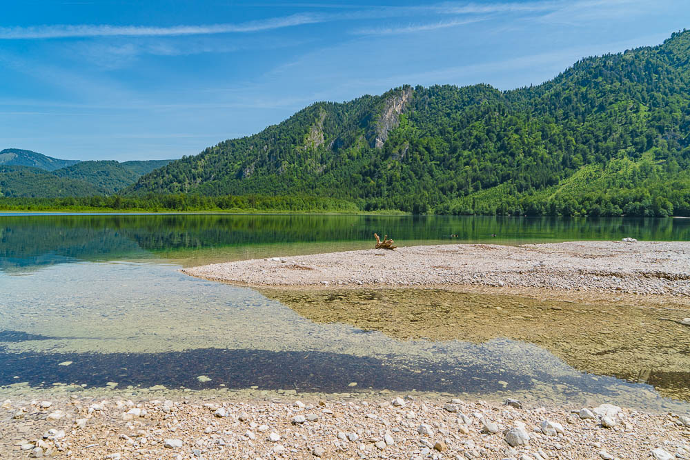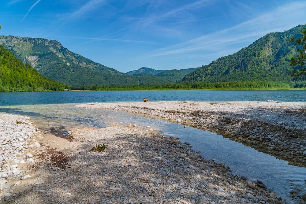 Etwas weiter eine Schotterbank, hier ist der Zufluss zum See durch den Rinnerbach, der aber momentan nicht (bzw. vermutlich nur unterirdisch) fließt.