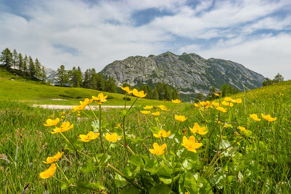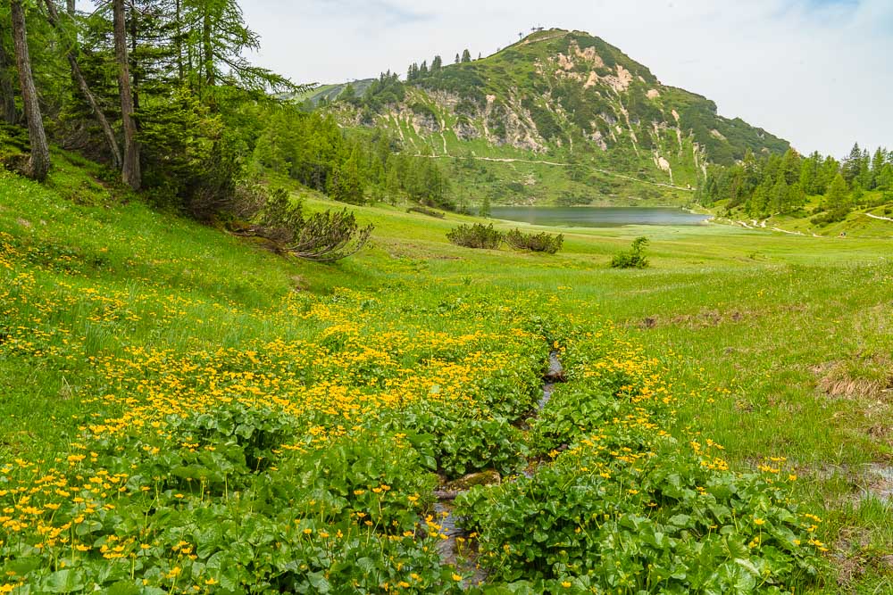 Sumpfdotterblumen (Caltha palustris) mit Blick zum Großsee.