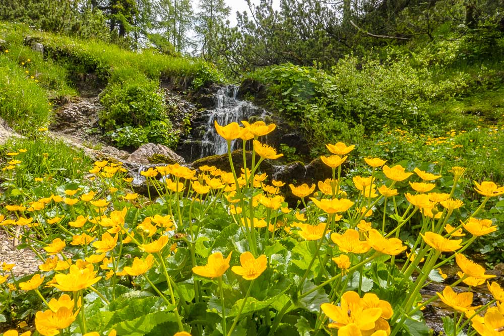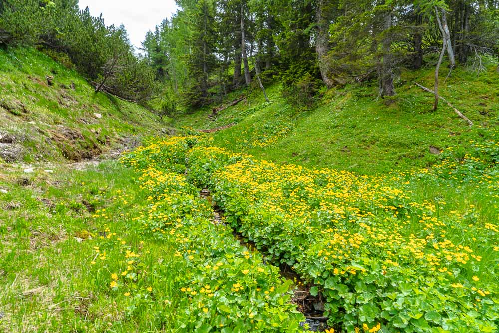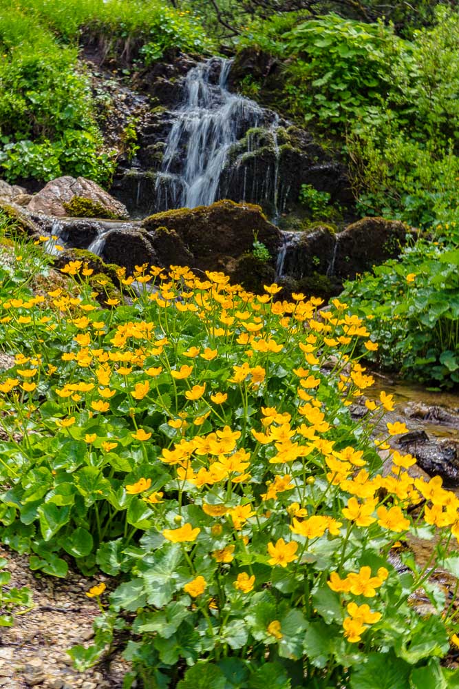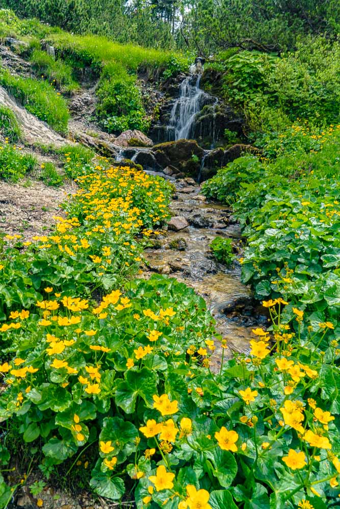 Sumpfdotterblumen (Caltha palustris) neben dem Bach