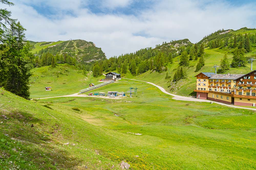 ... mit mehreren Unterkünften für die Schifahrer, rechts der Lift auf den Schneiderkogel.