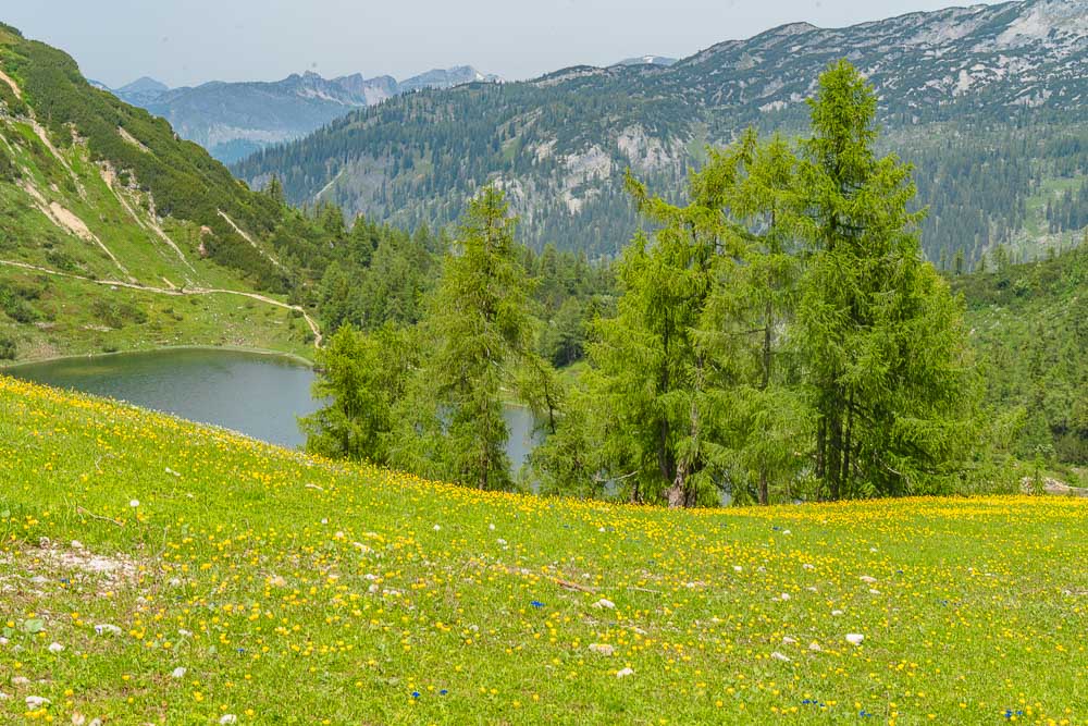 Auf einer kleinen Scharte der erste Blick zum Großsee, dahinter der Traweng.