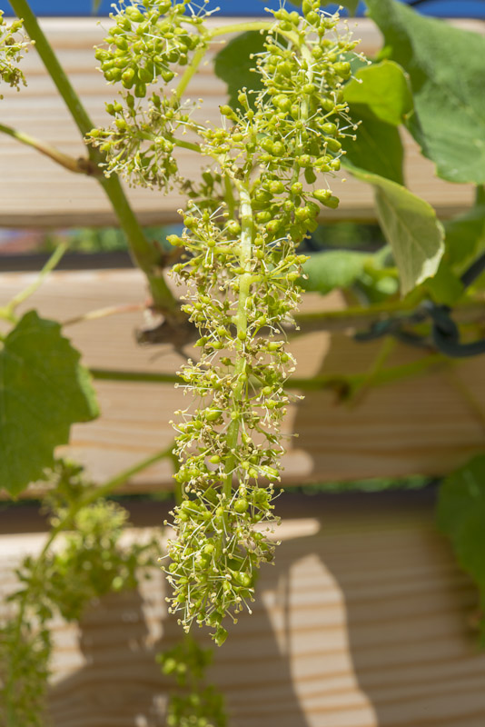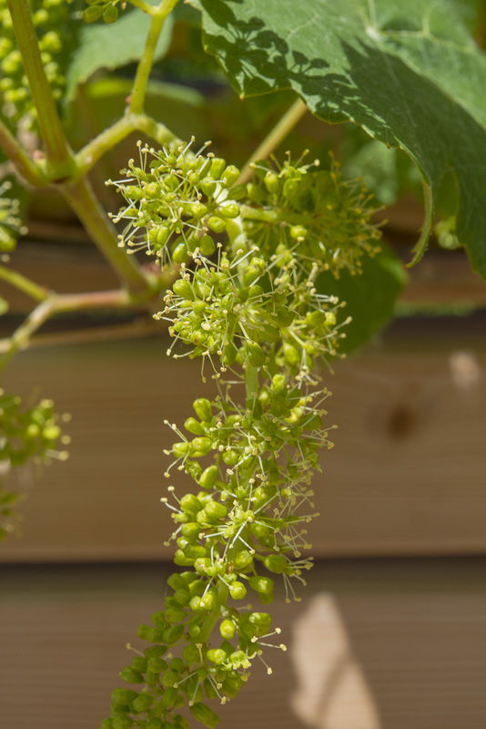 At home in my garden, the vine with the "blue Portugieser" - grapes is beginning to flowrish. I have mounted the branches on the new wooden wall, where they get optimal sunshine.