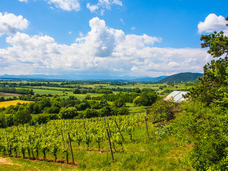 View over the Fischau vineyards to Winzendorf and the Wechsel region.