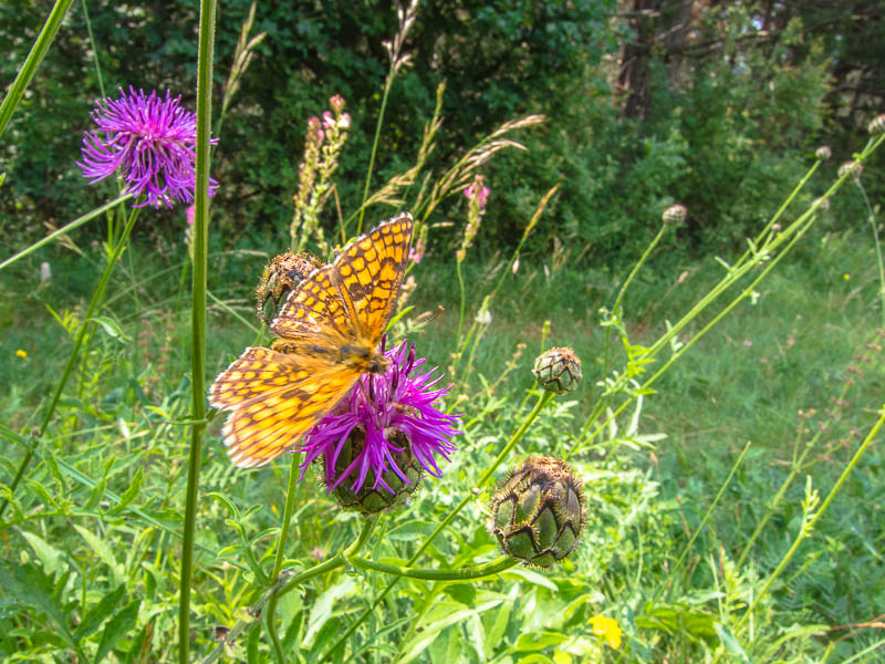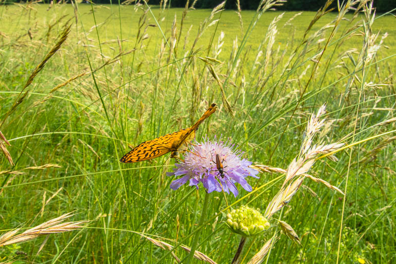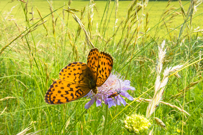 ... a marbled fritillary (Brenthis daphne) is sucking. A Stenurella melanura - beetle is joning. Thanks to Susanne Weickert for identification of the beetle!