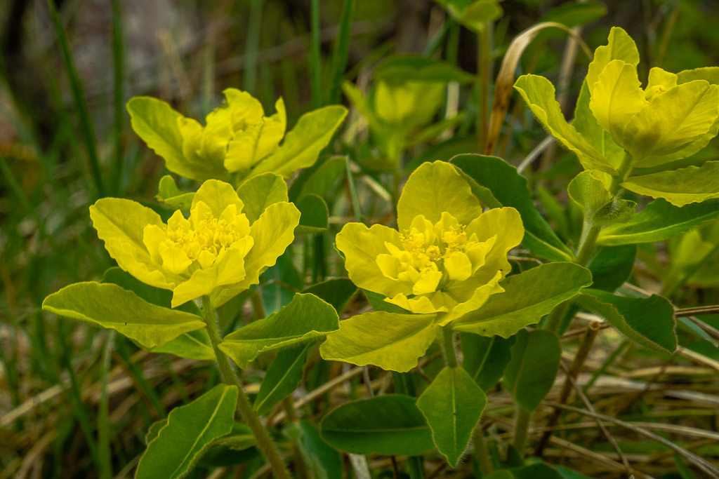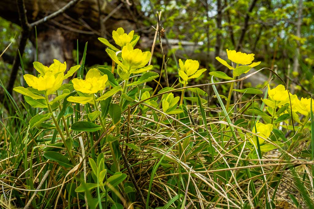 Vielfarbige Wolfsmilch (Euphorbia epithymoides) am Waldrand.