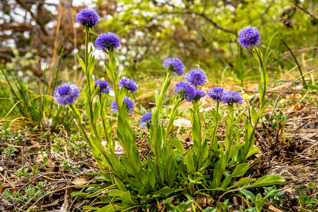 6.4.2019: durch lichten Wald und kleine Lichtungen steige ich von den Weingärten Richtung Marmorsteinbruch. Hier ein großes Büschel von Kugelblumen (Globularia bisnagarica).