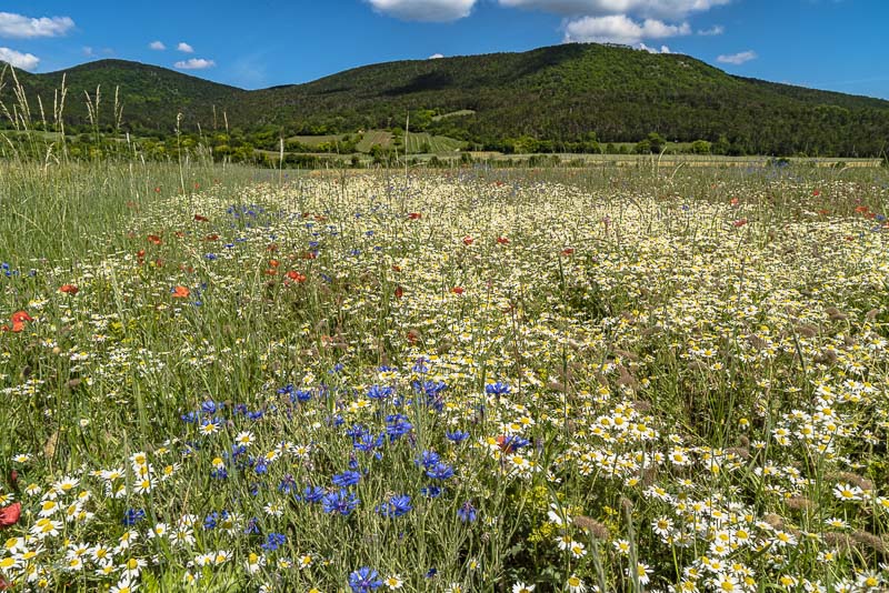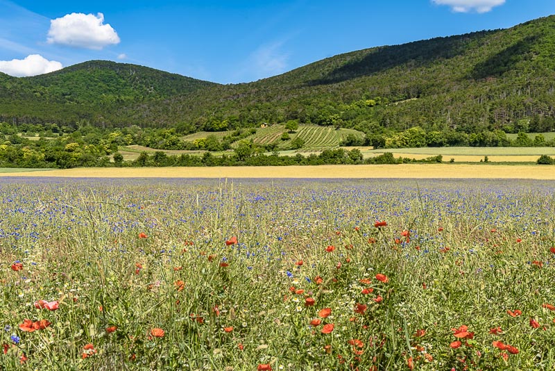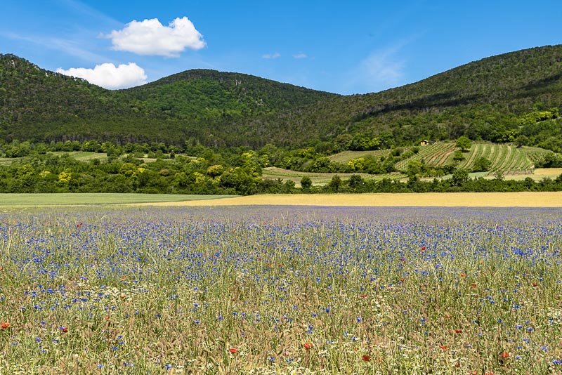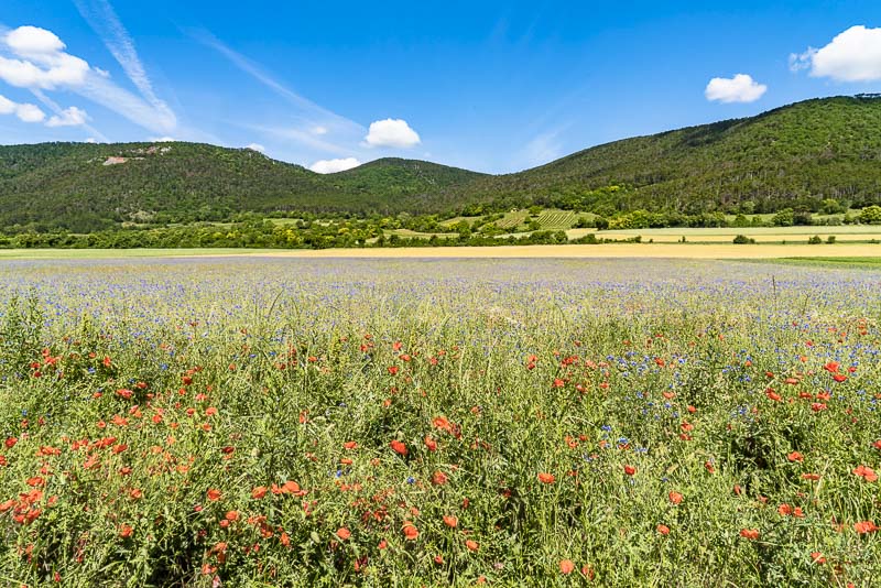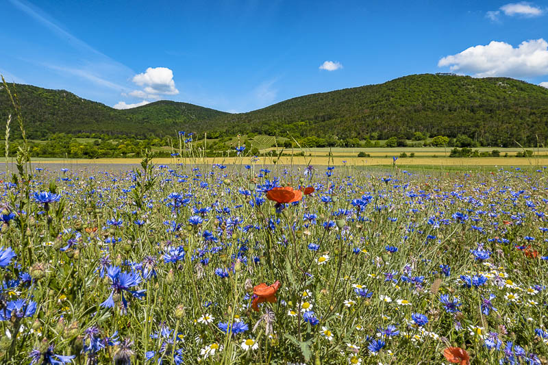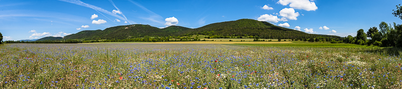 Panoramabildes Kornblumenfeldes, mit den Fischauer Bergen dahinter. Hierher oder ins Bild klicken für eine größere Darstellung.