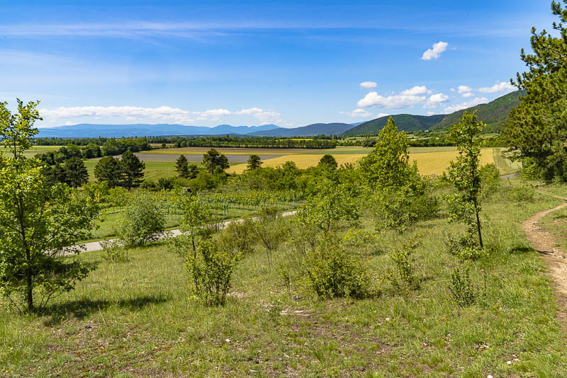 180 Grad - Panorama der Fischauer Vorberge. Hierher oder ins Bild klicken für eine größere Darstellung.